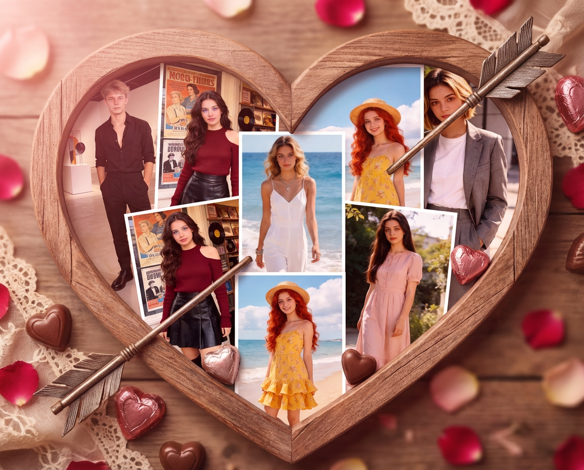 Create a heart-shaped photo collage with AI—perfect for Valentine’s Day cards, surprise posts, or printable gifts. Upload your photos, generate a clean heart layout with a soft pink glow, then download and share.