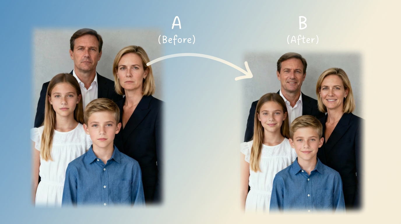 Turn a neutral expression into a realistic, natural-looking smile in seconds. Preserve your identity, lighting, and background—perfect for portraits, selfies, and group photos.